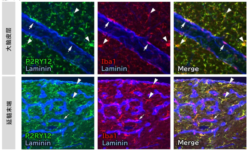 P2RY12(也稱為P2Y12)是一種腺苷5'-二磷酸(ADP)受體,也是嘌呤能G蛋白偶聯(lián)受體P2Y家族的成員。它在外周組織的血小板中表達,也在中樞神經(jīng)系統(tǒng)的穩(wěn)態(tài)小膠質細胞(Homeostatic Microglia)中特異性表達。由于P2RY12幾乎不在巨噬細胞中表達,所以它是用于區(qū)分存在腦血管周圍的巨噬細胞和小膠質細胞的有效標志物1)。此外,ADP可用作細胞損傷的信號,小膠質細胞中的P2RY12被認為在接收神經(jīng)細胞損傷方面發(fā)揮作用。